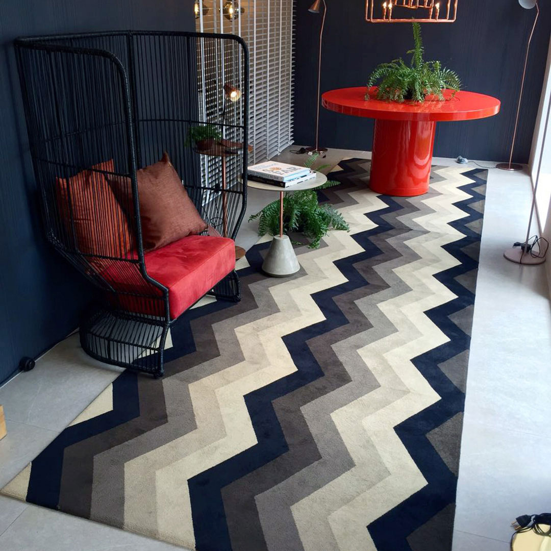 Puffs em tecido exclusivo e tapetes design no projeto contemporâneo em desenho geométrico.