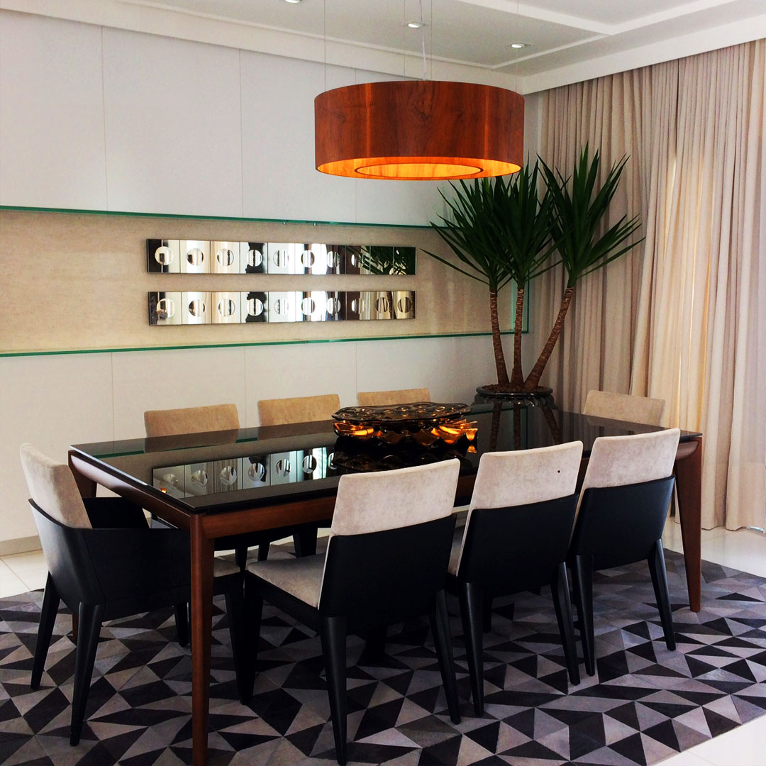 A sofisticada sala de jantar, projeto ML&N Arquitetos, foi decorada com tapete e cortina A. Carneiro Home.